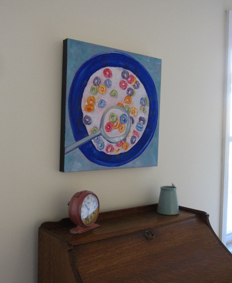 "Froot Loops" is a 20 x 20 inch oil on canvas painting with the sides painted black so framing is optional. It is available directly from me. Click here for more information. Additional photos are below.